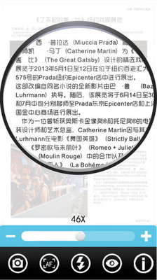 1、界面直观,启动应用即可使用放大镜,不需要任何额外的操作和设置,启动就能使用,放大效果是摄像头应用的2-3倍。
