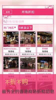 “不折不购”栏目涵盖海港城商场(Harbour City)、朗豪坊商场(Langham Place)、东荟城名店仓(Citygate Outlets)、时代广场(Times Square)、崇光百货(SOGO)、希慎广场(Hysan Place)、IFC商场、置地广场(Landmark)、太古广场(pacific place)、太古城中心(Cityplaza)、美丽华商场(Miramall)、The One商场、国际广场(I SQUARE)、K11、奥海城(Olympian City)、圆方商场(Elements)、青衣城(Maritime Square)、东港城(EAST POINT CITY)、新城市广场(New Town Plaza)、新都会广场(Metroplaza)、大埔超级城(Tai Po MeGa Mall)、永安百货(Wing On)、先施百货(Sincere)、莎莎化妆品(sasa)、卓悦化妆品(bonjour)等二十多家著名商场、outlet(奥特莱斯)及连锁店,内容包括香港服饰、奢侈品、美妆、化妆品、护肤品等多个种类,不论您是自由行还是参加旅行团,在香港购物消费,买名牌,买手机,买奶粉,看一下我们的“不折不购”,掌握最新打折优惠信息。