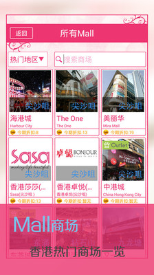 作为香港景点之一,“商场”栏目里面有香港各大商场所有品牌专卖店的店面和位置信息、牌子介绍、各楼层平面图、特色美食店、小吃店、药房、数码手机店以及商场所处地铁站出口等交通信息,本栏目既是全面的商场攻略,又是逛街查路的好帮手。