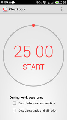 ClearFocus是一款设计简洁的番茄工作法时钟,你可以自定义自己的工作时间、休息时间以及长休息时间,为避免其它电话、短信以及通知等打扰你工作,你还可以选定在工作过程中让设备静音、断开网络等。