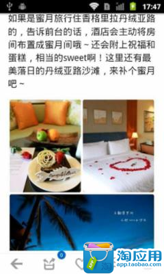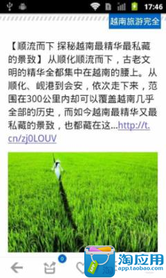 旅游让我们的身体感悟到不同的风和水,我们的头脑也在不同风情的滋养下变得机敏和多彩,目光因此老辣,谈吐因此谦逊。本应用为您提供最全面的东南亚旅游攻略,资讯支持收藏、评论,同时可以通过短信、邮件、微博等方式,分享给你的好友!微博包含腾讯微博、新浪微博、人人网、facebook、twitter等国内外主流SNS平台!