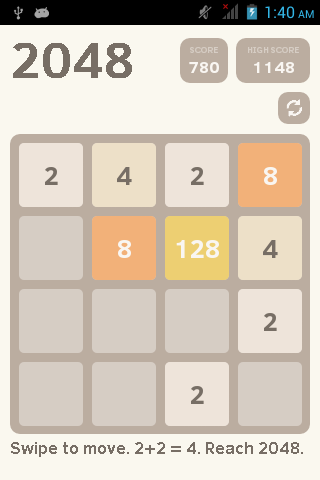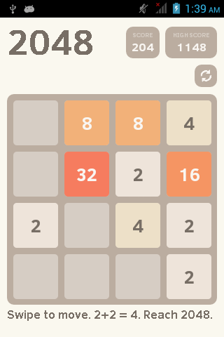 通过滑动磁卡来合并匹配的数字。如果滑动的两个磁卡上的数字相同,他们会合并成一个磁卡,上面的数字是原来两个的和。每一轮,一个新的磁卡会出现,上面你的数字是2或4。等到你的磁卡上面的数字变成2048,你就赢了。