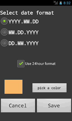 You can also set font color, adding date(not showing date), 24 hour format and date format in menu button.