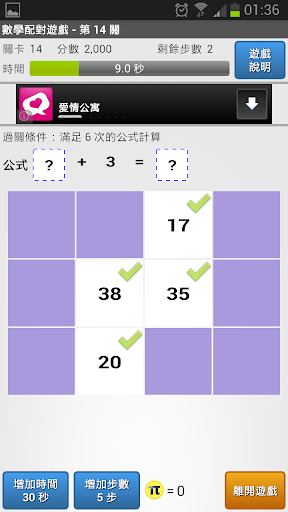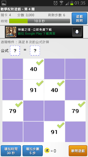 你的大腦可以同時記憶、算術和配對嗎?這個小遊戲可以測驗你在有限時間內的算術跟記憶能力。你的算術跟記憶能力夠強嗎?你能通過幾關的考驗呢?趕快下載玩玩看吧,不但可以打發無聊時間,還能訓練你的左腦跟右腦,這是練習算術跟記憶的超讚遊戲喔!