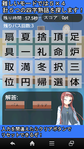 ④「難しい」では5×4のパネルから5種類の四字熟語を探します。