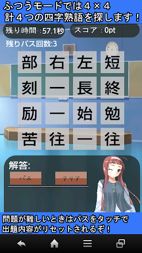 ③「ふつう」では4×4のパネルから4種類の四字熟語を探します。