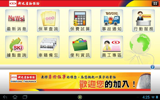歡迎使用新光產險APP HD,本程式提供新光產險各項服務供您查詢,隨時隨地提供您最完整的服務資訊!