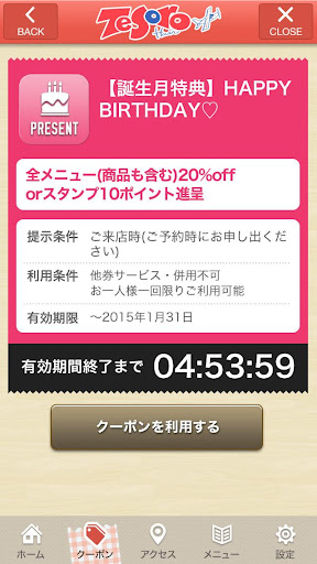 ●上記の誕生日クーポンは誕生日月に配信されるもので、アプリインストール時には発行されません。(クーポンを受ける為には、ユーザー側で任意の誕生日入力が必須となります)