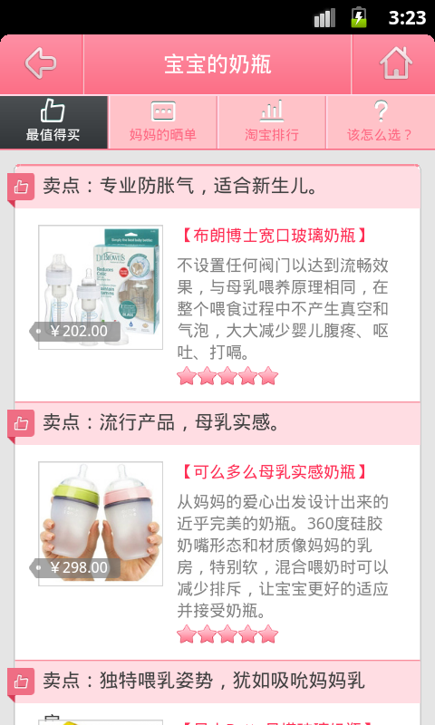 “新生儿购物清单”是新妈妈的购物指南。这里提供了宝宝出生后6个月内所需商品的完整清单,新妈妈可以按照清单类目来挑选购买其他妈妈们分享出来和强烈推荐的商品,还可以随时通过打勾的方式记录自己的购买情况。所有商品都来自妈妈们的真实晒单,每件晒单都附有妈妈的真实评价和使用体验。“过来人”妈妈帮助“新手”妈妈,让让每位新妈妈选购商品轻轻松松、明明白白、不纠结、不浪费!