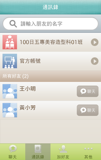 3、可查詢全校同學清單,並於對方同意後加入好友互傳訊息。