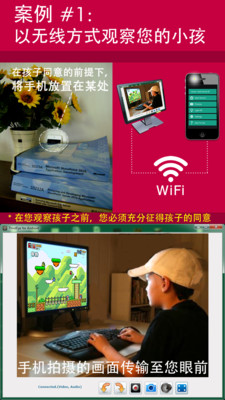 您在书房工作时, 是否想知道卧室内宝宝的状况? 厨房的煲汤是否烧开? 宠物是否又在破坏家具? 庭院是否有陌生人闯入?... 只要家里有 WiFi, 您就能坐在电脑前, 监视房屋内的所有情况, 监听房屋内任何声音, 保卫家庭成员与财产安全.