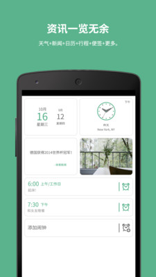 您可以通过早安工具直接、快速地获取您的日程管理表、日历,天气资讯、世界时间、日期倒数、备忘录、Flickr、 汇率信息、励志名言等等,无需您再打开第二个,第三个应用程序。