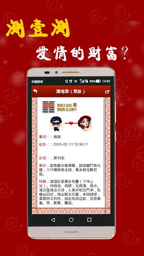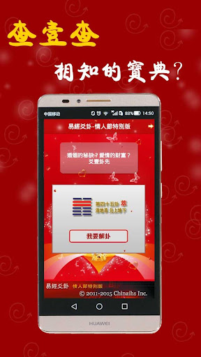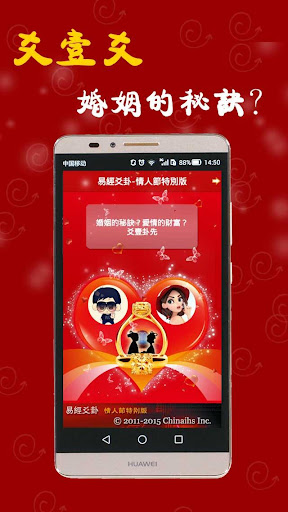 點燃蠟燭,降低聲音,穿著浪漫的衣服,打開妳的手機: 易經爻卦-情人節特別版 有壹個特別情人節的爻卦情節。為您們的婚姻、愛情爻壹卦。選擇您和他(她)的頭像,無名指輕輕放在他(她)的頭像上,閉上眼睛,感受他(她)的心跳,聆聽他(她)的心聲。