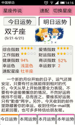 星座运势查询,顾名思义就是查询星座运势,星座运势1.0主要有星座运势查询以及星座速配两个功能;用简洁的的界面将每个星座的传说以及每个星座的性格呈现出来。总而言之,就是根据一个人出生日期所属的星座,来预测该星座在每一个流年甚至月份上的运势。还等什么?快点来预测下,开始美好的一天吧!