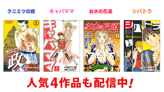 人気マンガ「クニミツの政」、「シバトラ」、「GetBackers」、「キャバママ」、「お水の花道」
