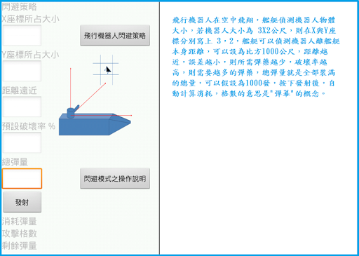 在使用這個 APP 之前,請將音量開大聲點 (因為開砲的時候幫各位準備了有趣的音效),首先,假設有一種感測裝置可測得空中飛行機器人座標以及大小,X與Y輸入空中飛行機器人所占的大小(也就是大約一個方型或圓型),經由某種測量工具測得這飛行機器人與自身的距離 (距離越遠則 + / - 誤差越大,這數值不提供),破壞率則是表達一種概念,在此不解釋,不用大驚小怪,很多 On-line 電動玩具(Games ) 不也有破壞率的概念嗎 ! 輸入的數字最多為四位正整數,輸入每一格後記得按下 Enter 代表你輸入了資料,全都資料輸入完畢後,按下發射,就會顯示出用掉多少量的彈幕 (再次提醒,不要大驚小怪,CS 電動玩具裡面也有打掉多少子彈的顯示資料,不要欺負我沒玩過 PC-Games ),飛行機器人此時遭到威脅了,在近身閃避反應中,Dodge Strategy 也就是閃避策略該如何執行? 按下"閃避策略"之後,會跳轉到飛行機器人內部,上方的九個格子與下方的九個格子分別代表物體上一秒與這一秒的資料,你能輸入的是 0 與 1 (如果不輸入 0 或 1 則會產生錯誤判讀,這資料到底怎麼由圖型變成 0 與 1 ? 如果您想不出來,請評這個 APP 一個五顆星,然後再寫信來問我吧。按下 Fuzzy ,經過智能判斷,得到某個閃避策略,這就是一個具有瞬間判斷飛行方向能力的智能機器人。