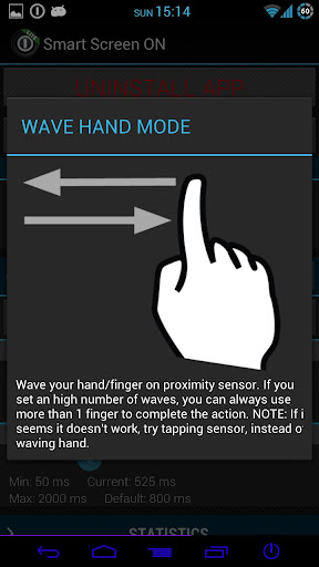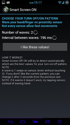 智能屏幕上是一個創新的應用程序,它把你的接近傳感器,一個電源按鈕。如果你有一個大的正面沒有物理按鈕(例如Galaxy Nexus的手機,你可以打開或關閉手機,只是輕敲或揮動你的手(手指)接近傳感器。