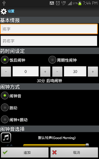 -周期性提醒 (首次服药后设定提醒,应用程序将提供周期性的闹铃提示)