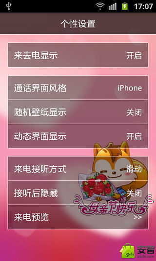 来电秀秀-个性来电软件强劲功能:1.界面里实现动态雪话效果,效果炫丽2.可设置三种通话界面风格3.可设置来电接听方式, 滑动,按钮4.可选择自己喜欢的贴图5.内含手机归属地查询功能6.可先预览你设置的界面效果持续更新,敬请期待!