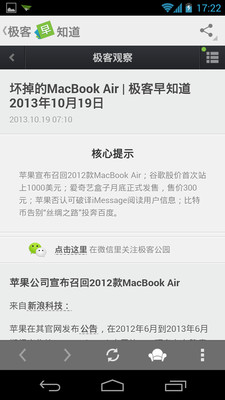 「极客早知道」每次汇编 5 条重点新闻, 每天更新一篇。通过「极客早知道」的 Android 客户端你可以第一时间获得来自服务器的推送, 并可以方便将资讯分享给你的好友。