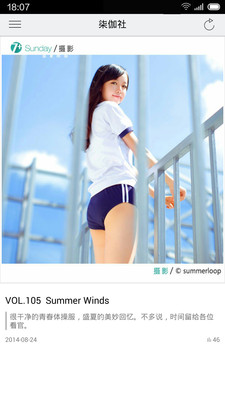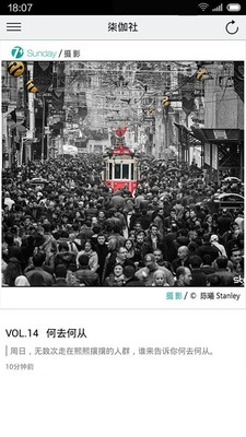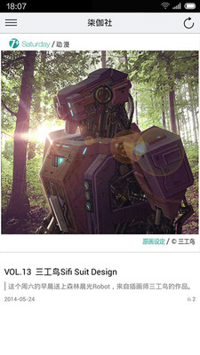 这款「柒伽社」其实是一款创意图文软件。在首页,每天会推送一篇设计案例,我们只要像翻页一样就可以翻看到过往的案例。而侧滑栏主要分成两块,一块是设计讨论区,另一块是团队介绍区。