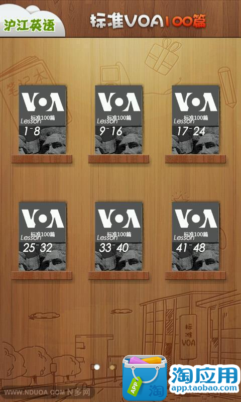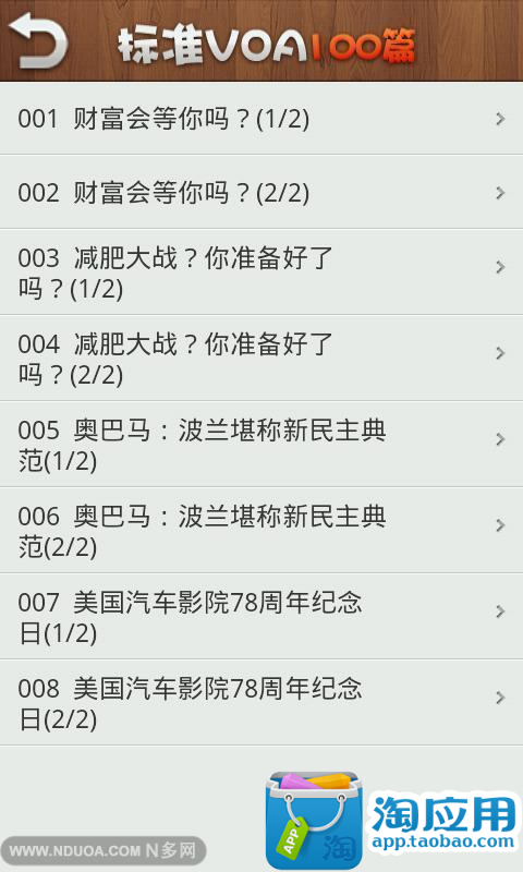 标准VOA精华100篇[1.1]成立于2006年的老牌沪江【标准VOA听写】一直长久不衰,开办6年多来,一直受到广大沪友的喜爱。如果说BBC的英式发音可以被称为Queen's English(女王英语)的话,那么VOA纯正的美式发音毫无疑问便是President's English(总统英语),从亚伯拉罕·林肯的“葛底斯堡演说”到富兰克林·罗斯福的“炉边谈话”再到巴拉克·奥巴马的“Yes,we can”,一代又一代的美国总统用纯正的美音引领着时代变革的潮流。为了便于大家随时随地学外语,沪江网特别推出2011年的100篇标准VOA听写精华做成安卓应用,每篇材料长度为1分钟左右,适合精听,听力材料由沪江听写酷英语编辑部各位优秀的小编经过特别精选,不仅精心打造最完美原文与最佳译文,更为大家特别附赠贴心注解,让大家的听力训练如虎添翼!