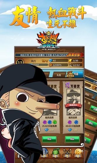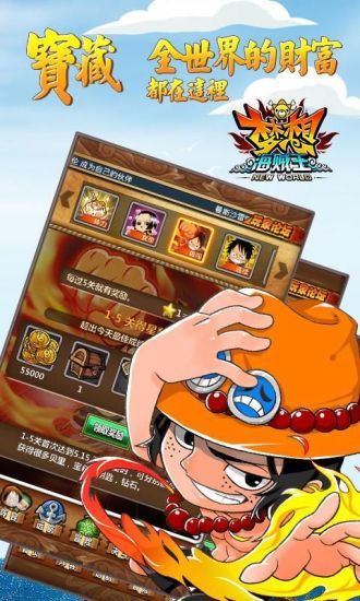 《梦想海贼王》是一款卡牌类手游巨作,游戏以全球第一超人气动漫《海贼王》为题材,用Q版风格配合新奇多样的玩法,采用新颖的战斗模式,严格遵循《海贼王》的故事发展线路,超高水准的重现了原作中的海贼世界!