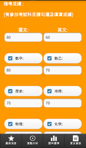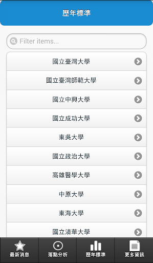 提供全國各大學科系歷年的上榜門檻,讓您對喜歡的科系有進一步的分數參考,同時也提供快搜功能,可直接key入想知道的校系,觀看最低門檻。