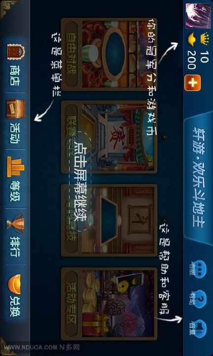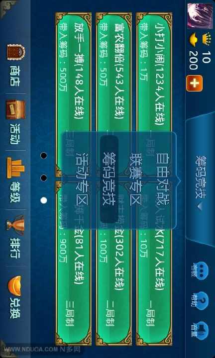 自由对战:跟传统的欢乐斗地主玩法完全相同,玩家可在这里赚取游戏币;