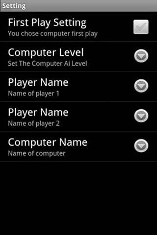 在對戰介面按菜單鍵打開菜單后可以看到一些遊戲選項。在設置里可以進行一些遊戲設置,包括先手設置,電腦難度等級,玩家名稱,電腦名稱,電腦對戰模式電腦每步落子的時間間隔等。