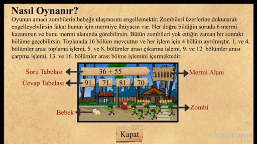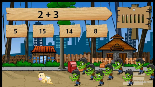 該遊戲的目的是為了防止殭屍到達嬰兒。您可以通過點擊他們阻止殭屍,但你需要的子彈吧。你知道所有正確的問題,你在它的六顆子彈就可以看到子彈奪冠。消滅所有的殭屍時,你可以書寫新的篇章。有16個事件中總的和每個過程分為四個部分。 1和4部門之間的收集過程中,第5和第8章加減之間,第9和第12,第13和16之間的乘法運算包括跨部門的分工。