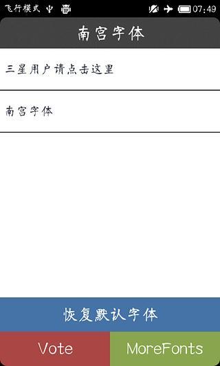 民间南宫体(Font for FlipFont),完全免费,理论上支持所有手机。 这是作者最新研发的功能最全面的字体直装包,直接支持三星Galaxy系列(除了google开发者系列手机和所有已Root的手机。完美替换字体。让您的launcher,QQ,微信,微薄充满个性,是您需要的手机字体管家。 使用本软件前,请认真阅读以下使用说明:(1)如果您的手机是三星Galaxy系列手机,那么点击设置-->屏幕显示-->字体风格。与手机上的FlipFont程序是兼容的。 (2)如果您的手机不是三星Galaxy系列手机,那么您需要把手机Root,获取系统权限,才能使用本软件。如需Root,可以通过电脑端登陆http://sj.qq.com/root ,里面有方便的一键Root工具。如果手机已经root,直接点击程序名字按钮,一键替换字体。如果您不满意这个字体,点击恢复字体,软件将会帮您恢复默认字体。 If Your phone is Galaxy S4,limited to samsung ,you have to go to system "Settings" select the "Display" option and then select "Font style" option ,choose an available font instead of the default font .Then in the app's "Style Preview" page you can change font by click the one you want to use.Thanks." 请注意:如果您是使用Root的方式更换字体,每次更换字体,都需要重启您的手机,字体才能更换成功。 本软件是作者精心准备,辛苦开发的,请不要因为您的手机还没Root,或者不是三星Galaxy系列手机等各种硬件原因不能使用而给本软件差评。作者开发好辛苦的。如果可以,谢谢各位亲们给个5星评论,多多支持开发者。谢谢了。 声明:本软件与FlipFont,三星Galaxy等机构无关,所有FlipFont,Galaxy商标的版权,均属于他们自己相关的机构。