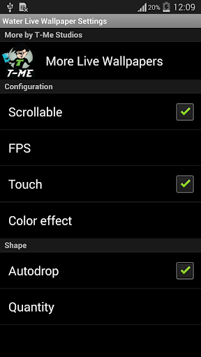 您可以增加元素的大小、速度,或者密度,还可以选择三种不同的颜色效果和三种不同的颜色强度。若要自定义,打开应用,点击“设置Live Wallpaper”,然后点击“设置”
