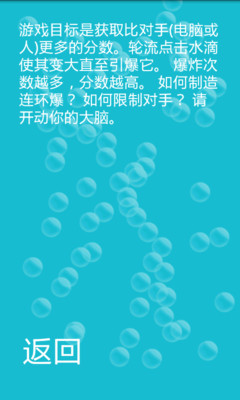 和对手轮流触摸水滴让它变大,爆炸,水星四溅,再引爆周围的水滴,制造连环爆炸。爆炸越多,分数越高。超越你的对手吧!游戏支持单人对战电脑AI和双人对战。别小看AI对手哦,它可是很狡猾的。游戏玩法简约却不简单。既要让自己得更多分,又要想办法限制对手得分。胜利属于智者!