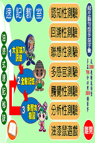 在「油漆式速記法-超左腦句型多益字彙」正式版收錄多益測驗必考2000個單字及2000題精選句子。結合右腦直覺性速讀與左腦思考性測驗,達到多重感官刺激全腦學習的驚人效果,迅速將單字記憶轉換為長期記憶。主要功能包括認知性、回溯性、聯想性、多感官、觸覺性、分析性、油漆鼠遊戲等測驗單元。