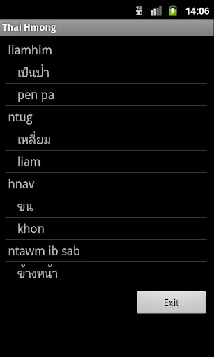 泰國苗族(羅馬拼音)的詞典 - 旅遊的詞典翻譯泰國或拼音泰國的列表詞語的羅馬拼音苗族苗族顯示。這本字典也意味著從語音苗族泰國或拼音泰國。複製一個單詞的反向翻譯的翻譯列表,可以使用同義詞和理解更廣泛地使用在泰語的苗族字。儘管泰國苗族的字典不提供定義或實例,以這種方式使用的翻譯軟件,為您提供了一個機制,在泰國方面的定義,而不需要更好地了解苗族的話。 20K引用。