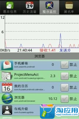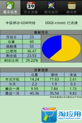 本软件是一款安卓手机流量监控专用小工具,同时支持网络防火墙设置,只有500k不到哦。界面简洁,操作简单。主要功能有:1、实时流量数据显示。小巧透明的悬浮框设计,随时随地帮助你掌握手机流量信息。2、实时监控某个程序的上网流量,抓住任何企图偷走你流量的坏蛋。并且在有root权限的情况下可以通过网络防火墙禁止任何程序联网。3、用户套餐流量提醒,避免运营商坑爹。4、详细的历史流量数据,让用户做到心中有数,有据可查。软件中有作者联系方式,有任何问题和建议欢迎联系。你的支持是我进步最大的动力。