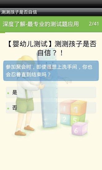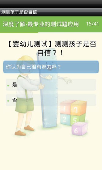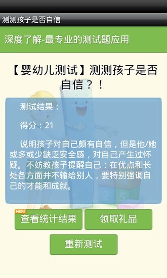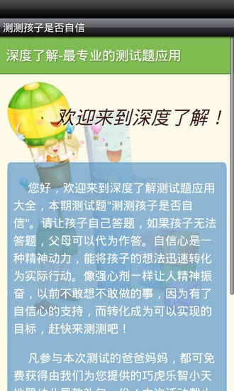 [深度了解]本期测试题"测测孩子是否自信"请让孩子自己答题,如果孩子无法答题,父母可以代为作答自信心是一种精神动力,能将孩子的想法迅速转化为实际行动像强心剂一样让人精神振奋,以前不敢想不敢做的事,因为有了自信心的支持,而转化成为可以实现的目标,赶快来测测吧!凡参与本次测试的爸爸妈妈,都可免费获得由我们为您提供的巧虎乐智小天地婴幼儿早教礼包一份