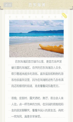 普吉岛位于印度洋安达曼海东北部,离泰国首都曼谷867公里,有深远的历史和文化,现在是泰国主要的旅游胜地,以其迷人的风光和丰富的旅游资源被称为“安达曼海上的一颗明珠”。 本应用为游记攻略,应用中展示了普吉岛的旅游景点和景点介绍。