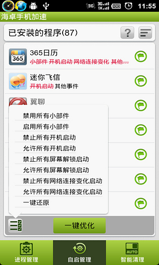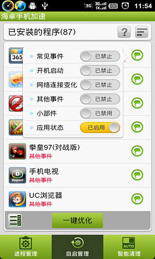 2. 一键优化:首创基于事件的自启管理,让应用不再自动后台启动!(需root权限)