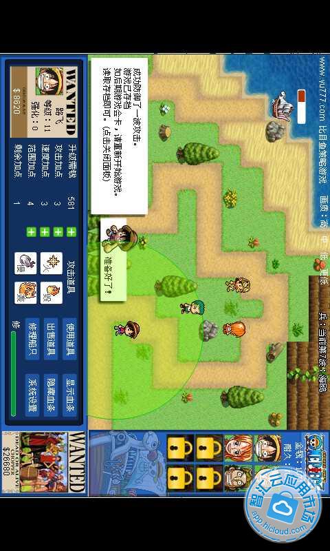 一波波的敌人正在试图攻击路飞一行人的海贼船,请务必保护好海贼船。守护海盗船成功后,就可以踏上One Piece的路程了,财富正在等待着你。点击“开始游戏”点击选择难度后即可进入游戏状态。 阻止所有的敌人攻击海贼船。