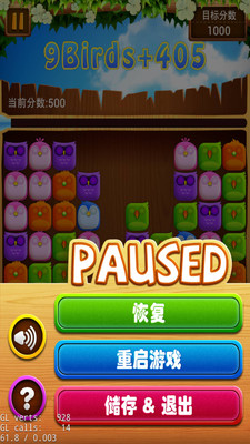消除小鸟,达到目标分数即可过关,来看看你能通过多少关吧!,如相连的小鸟大于2则可消除,相连数越多越好,最后如果剩余小于10则可以得到额外的加分。