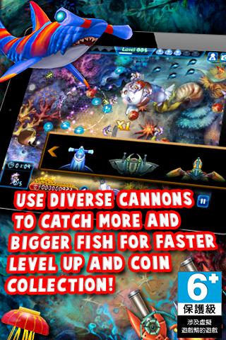 你可以利用 4 種不同類型的炮台武器震暈魚群、接受各種刺激好玩的任務如「捉住這條魚」和「尋找寶藏」,還可以從珍珠貝、每日幸運輪盤、具備人工智慧的首領級魚群和「特殊遊戲」模式中收集珍珠和鑽石。