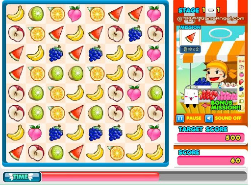 游戏水果 五颜六色的新鲜水果吃被放进这个游戏。你会得到乐趣与游戏交替的水果。享受充满活力和独特的果形。它的甜味和咸味的同时并排通过拖动它们将比分切换同种的果实3或更高版本以清除完全限制。并确定时间你要交换的水果时间用完之前。当切换开关时间增加下一次。让我们来看看成熟风骚
