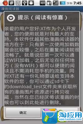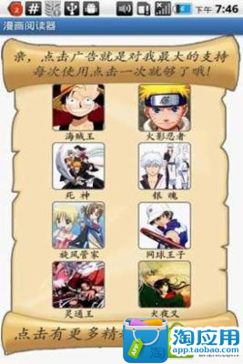 电脑阅读受到地域的限制诸多不便,故设计这个Android手机漫画阅读器,无论在等车,排队,还是等人..都可以便捷的使用本软件,包含了海贼王,火影忍者,死神,银魂,旋风管家,网球王子,灵通王,犬夜叉..以后还将陆续更新更多流行的漫画....本软件优越其他漫画阅读器的地方在于:只有第一次使用加载数据会比较慢,之后在重复阅读就很流畅了.就是说您第一次可以通过WIFI加载,之后无论在任何地方(没有WIFI)都可以便捷的阅读且不需消耗您手机的流量.同时还有一份神秘礼物等着您,还犹豫什么呢?快点开始你的漫画之旅吧!