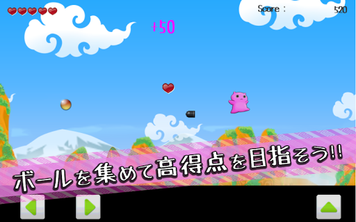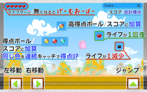 黄・赤・青のボールを取って得点を稼ごう。同一色のボールを連続して取ると得点が上がっていくよ
