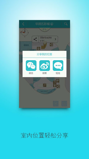 • 支持分享室内位置给微信好友,分享我的位置到新浪微博