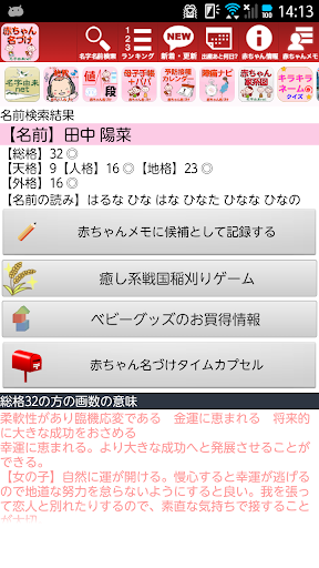 名づけたい名前と名字を入れるだけで簡単に字画や漢字の意味がわかります。また、名字を入れて検索するだけで、数万種の名前の中から名字と字画の良い名前もわかる、赤ちゃんの名づけの参考にできるアプリです。