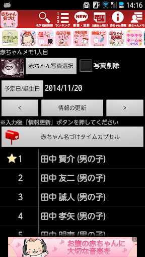 ・「赤ちゃんメモ」には名前の候補だけでなく赤ちゃんの写真も登録することができます。お子様が成長された際に、名づけ候補とともに見ることができます。