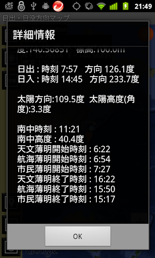 日の出、日の入り、月の出、月の入りの時刻・方向を知ることが出来るカメラマンの必須ツールです。